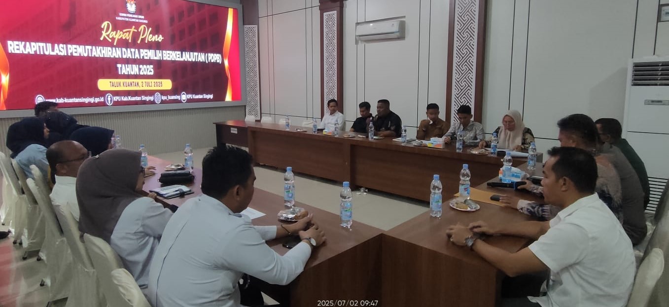 Teluk Kuantan 2 Juli 2025– Dinas Kependudukan dan Pencatatan Sipil Kabupaten Kuantan Singingi menghadiri Rapat Pleno Rekapitulasi Daftar Pemilih Berkelanjutan (DPB) yang diselenggarakan oleh Komisi Pemilihan Umum (KPU) Kuantan Singingi pada hari ini Rabui 2 Juli 2025, bertempat di Aula KPU Kuantan Singingi.